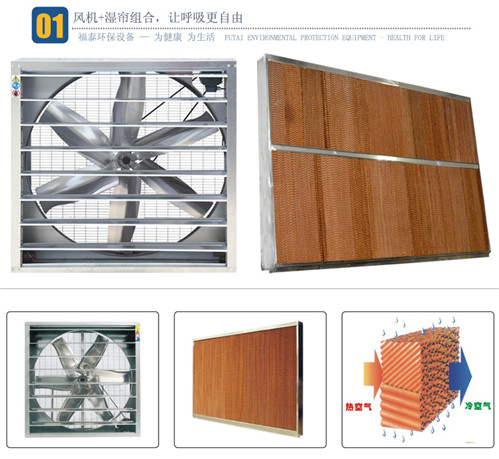 濕簾裝在密閉房舍一端山墻或側(cè)墻上,風(fēng)機裝在另一端山墻或側(cè)墻上,降溫風(fēng)機抽出室內(nèi)空氣,產(chǎn)生負(fù)壓迫使室外的空氣流經(jīng)多孔濕潤濕簾表面時,使空氣中大量熱量進行轉(zhuǎn)化處理從而迫使進入室內(nèi)的空氣降低10-15℃,并不斷的引入室內(nèi)進行防暑降溫。
