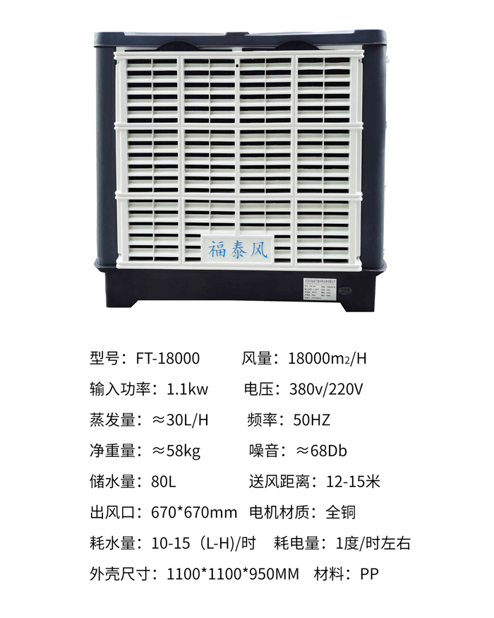 福泰環(huán)保空調性能穩(wěn)定在越炎熱的天氣下降溫的效果越好。適用于開敞式及半開敞式環(huán)境,能夠直接輸送自然風及輸送降溫后的涼風。室外新鮮空氣經福泰蒸發(fā)式冷氣機過濾、降溫后向室內源源不斷的大量輸送,將室內帶有異味、粉塵和混濁悶熱的空氣排出室外,同時兼顧換氣降溫及增加空氣含氧量等多種效果。